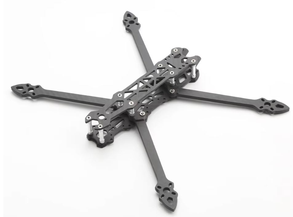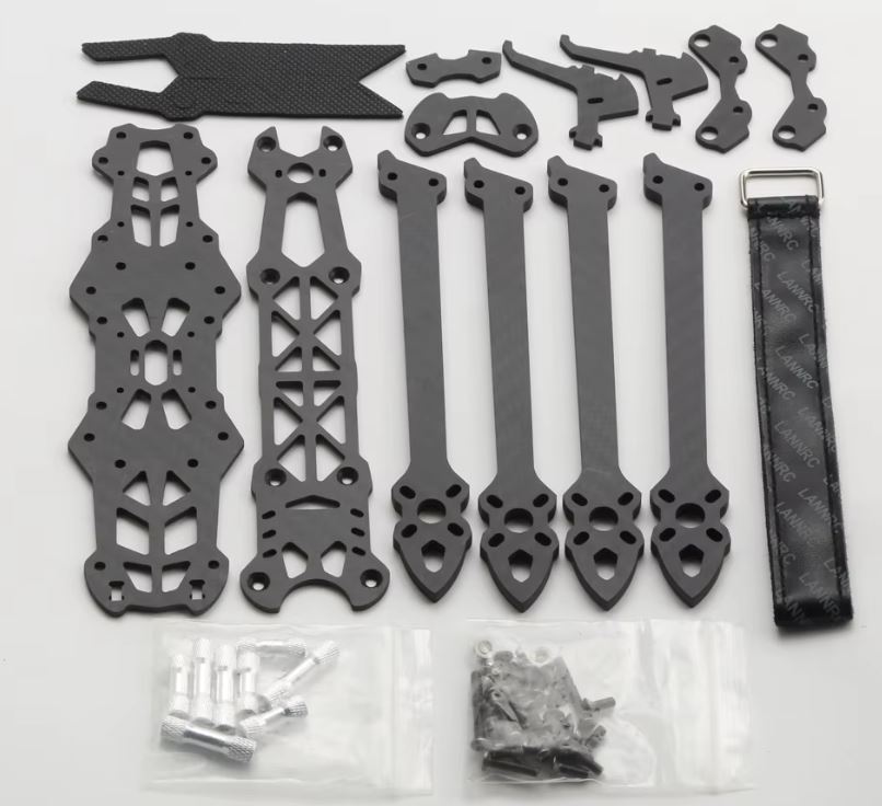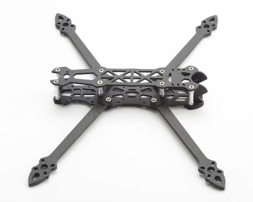 Los brazos de 5 mm de grosor, son piezas clave; su robustez permite soportar impactos a alta velocidad, mientras que su facilidad de reemplazo es vital en reparaciones rápidas. Estos chasis están pensados para albergar motores de alto rendimiento y hélices de 5 pulgadas, proporcionando la sustentación necesaria para freestyle o carreras.